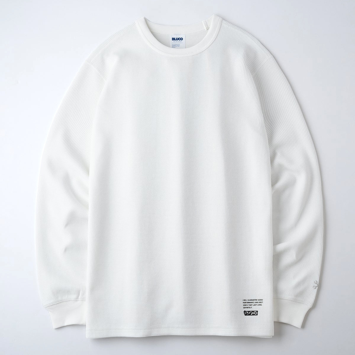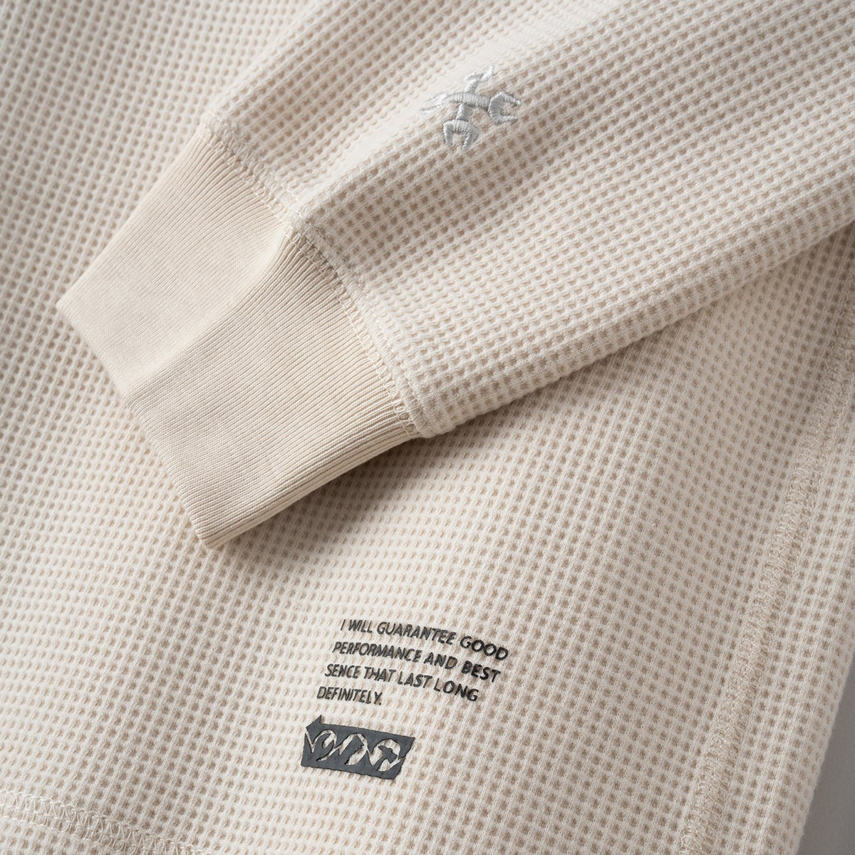 高い保温性を誇るワッフル編みの表面と、肌触りの良いフラットな裏面を組み合わせた生地を採用。